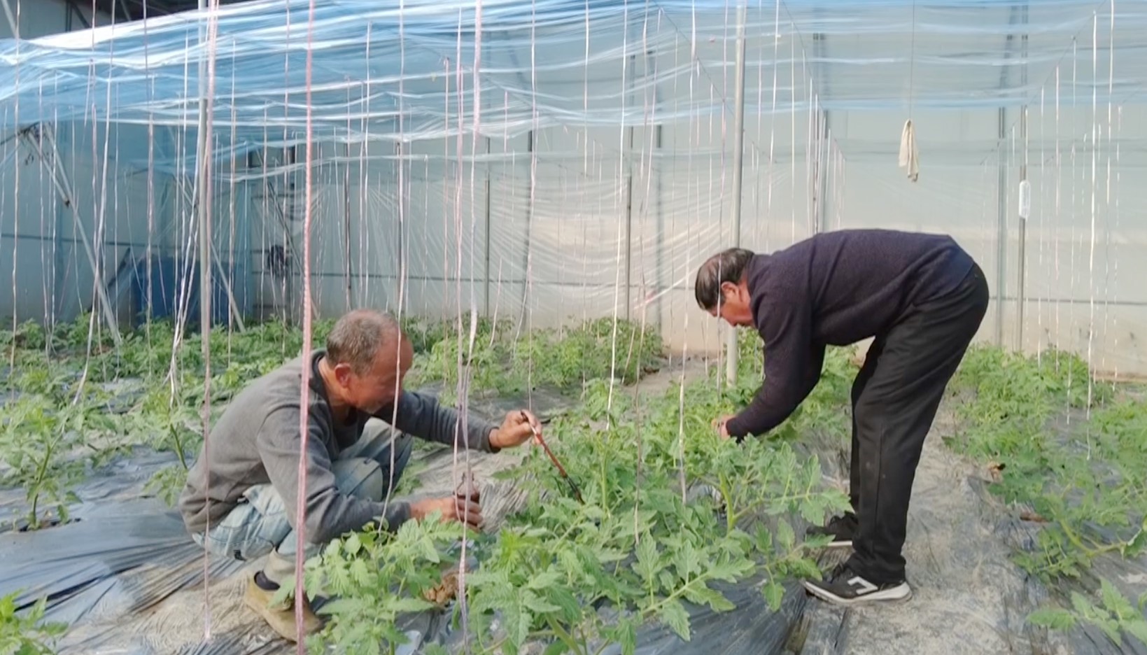 “西红柿苗长势很不错,我们现在进行的工作就是吊苗、授粉。通过人工授粉,结出的果实果形端正、品质统一,精品率和商品价值都大大提升。”大棚蔬菜技术员王增林一边查看植株长势,一边介绍。