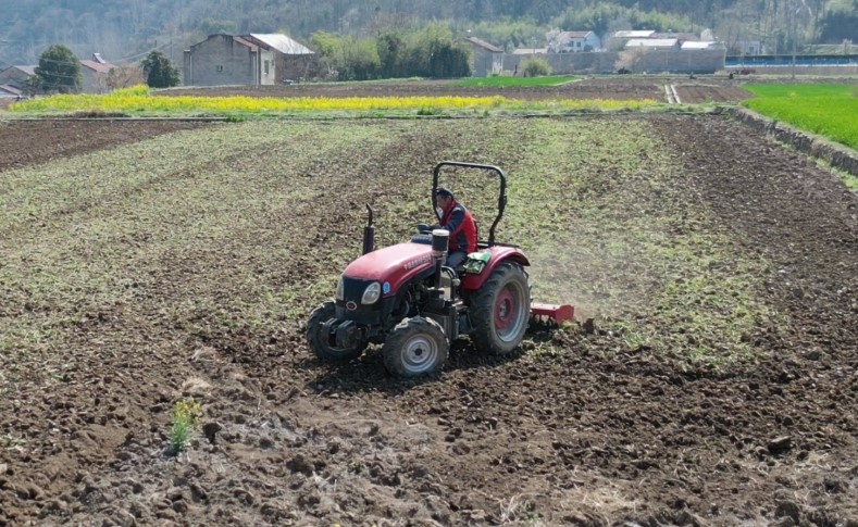 农机人员驾驶翻耕机进行翻土作业,为甜叶菊苗移栽做准备。